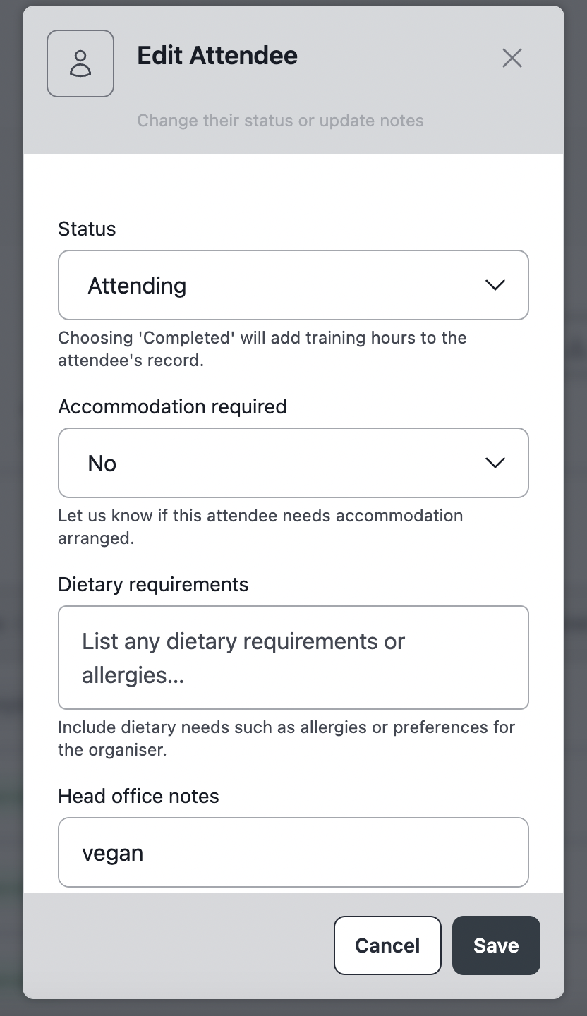 - Use the pencil icon to change status: Attending / Waitlisted / Completed.
