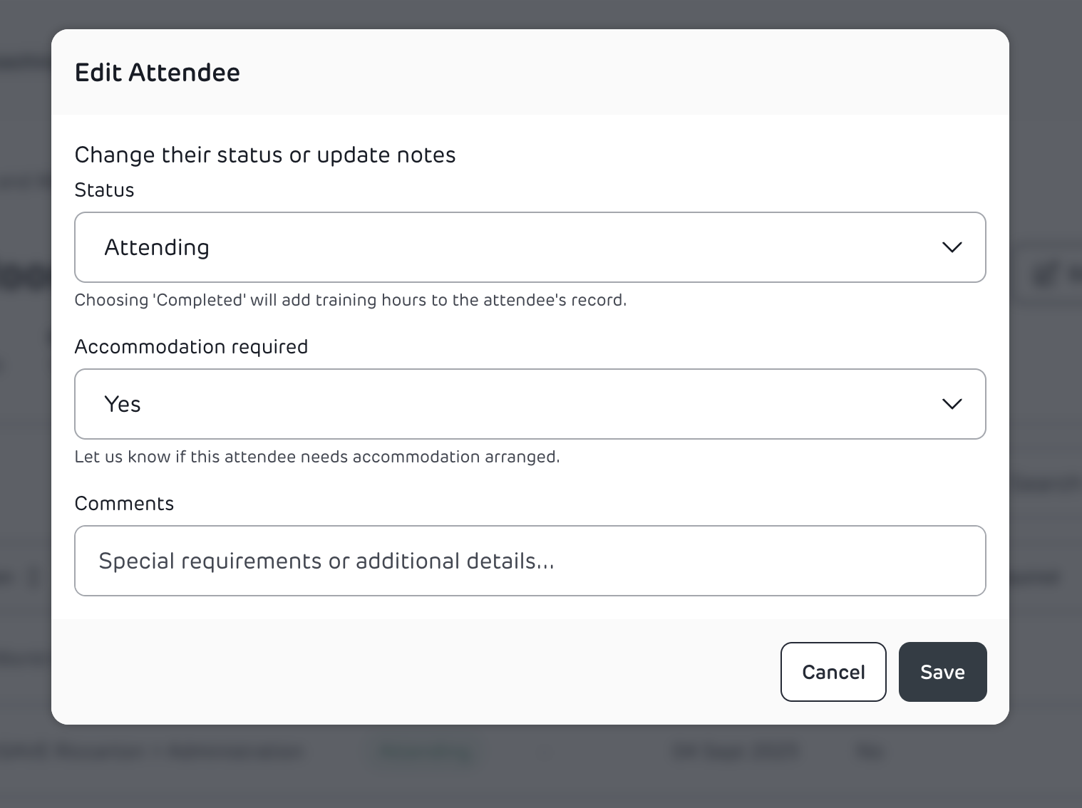 - Edit attendee → set Status = Completed Training.