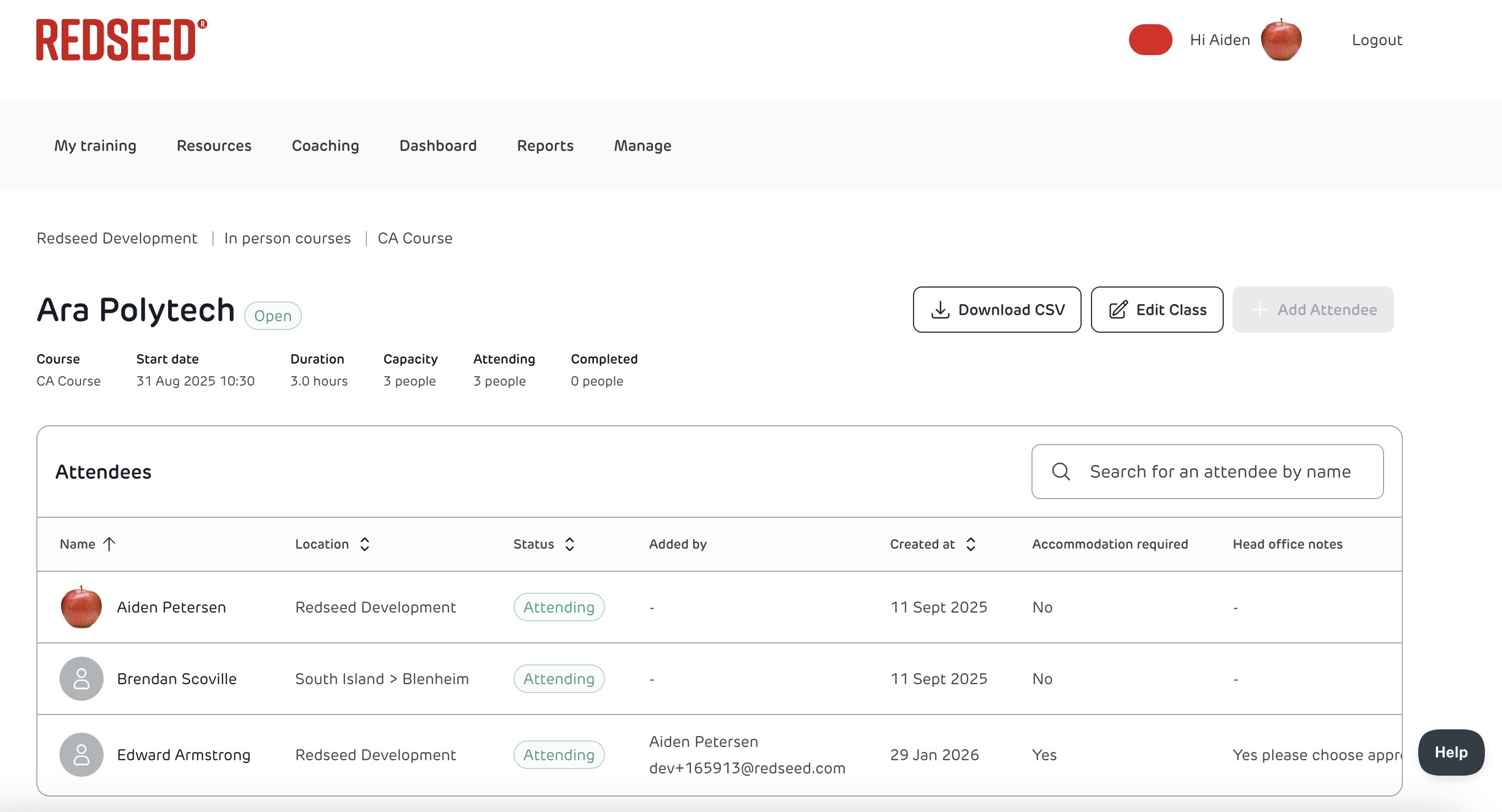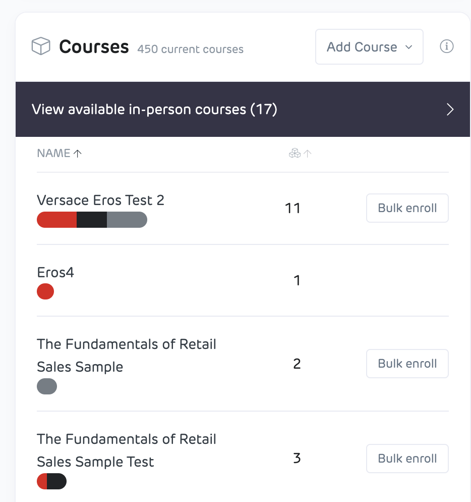 Administrators and managers can add team members at their location and below as attendees for in-person courses.