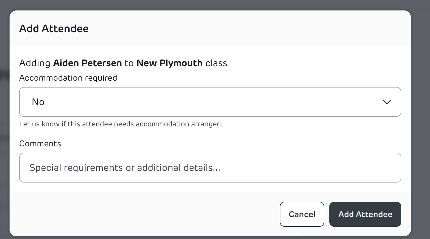 - In the pop-up: Confirm whether the attendee requires accommodation and add any special requirements or notes.